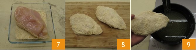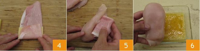 and roll the cooked ham to wrap the cheese 4, fill the pocket with the stuffing 5 and fold the meat over itself. Proceed in the same way with the other chicken slice. Then prepare two bowls: one with breadcrumbs and the other with eggs beaten with salt. Dip the 2 cordon bleus in the egg on both sides 6, making sure the chicken slices are completely coated with egg;