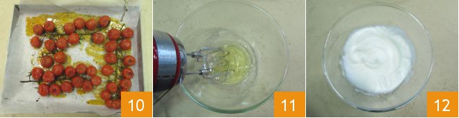Add salt to taste and bake in a preheated static oven at 390°F for 40 minutes. After the cooking time, remove the cherry tomatoes from the oven and let them cool 10. Using an electric whisk, whip the reserved egg white along with another 35g of egg white until stiff peaks form (11 and 12).
