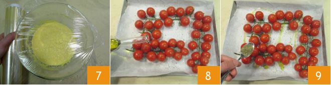 Cover with plastic wrap 7 and let it sit at a temperature of 80°F for about 90 minutes. In the meantime, take care of the cherry tomatoes: take the bunches without detaching the tomatoes and wash everything under running water. Place them on a baking sheet lined with parchment paper, drizzle with oil 8 and dried oregano 9.