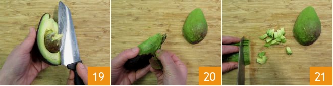 Cut an avocado in half, remove the pit 19. Peel the avocado 20 and then dice the flesh 21.