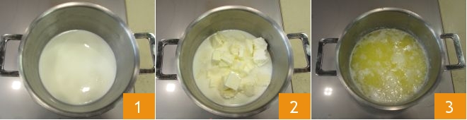 To prepare the cornbread, you must separately prepare the liquid and powdered ingredients and then mix them together at the end. This method is called the "muffin method." In a saucepan, start heating the milk 1 and add the butter in pieces 2. You should heat the mixture until the butter has melted 3.