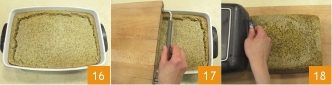 Once baked, remove the cornbread from the oven 16, let it cool slightly, and then place a cutting board on top to invert the pan 17; gently remove the pan 18,