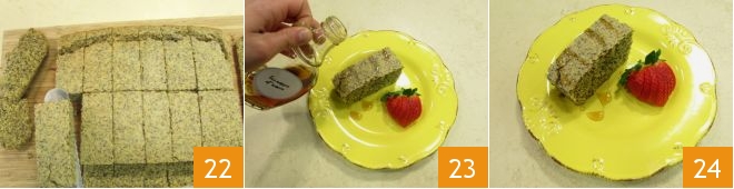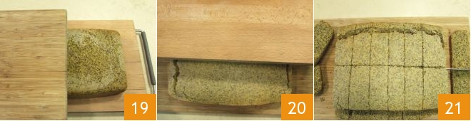 then place another cutting board or a rectangular serving plate on top of the cornbread 19 and flip it again 20. Cut the cornbread into many rectangles to serve it 21.