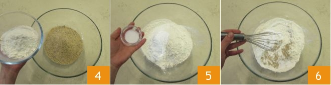 In the meantime, in a bowl, pour the all-purpose flour and black cornmeal 4, then the instant yeast for savory preparations and the salt 5. You must mix everything thoroughly with a whisk 6.