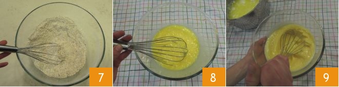 This phase is very important to distribute the leavening agent evenly 7, to obtain a bread with uniform cooking, without taller or shorter parts. In another bowl, pour the eggs and beat them 8. Now it's time to add the warm milk and butter mixture to the egg mixture. To prevent the egg from cooking and creating a "scrambled egg" effect, wait a few minutes; then place a dry cloth under the bowl with the beaten eggs, take the whisk, and slowly pour the warm milk and butter mixture while stirring energetically and continuously 9.
