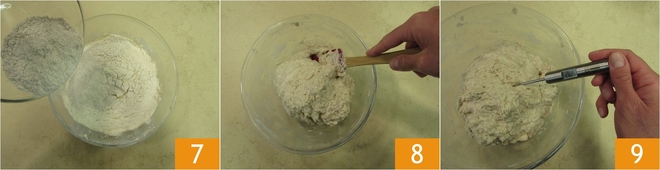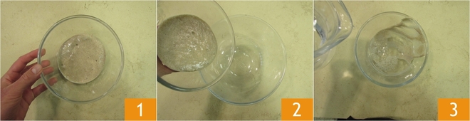 Stir to dissolve any residues 4 and pour everything into the large bowl with the sourdough 5. Mix with a spatula to soften the mixture 6.