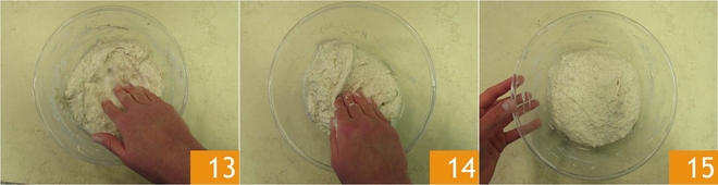 Press with your fingertips to dissolve the salt 13. Now gently lift one of the outer edges of the dough and bring it to the center 14. Rotate the bowl and continue this operation. In this way, the water will be absorbed, and the dough will not stick to your hands. Indeed, the hand should not be sunk but only placed. Keep pouring the water and repeat the operation, first pressing the dough, then bringing it to the center. As you can see, the dough now starts to take shape, give the dough some folds within the bowl, then set aside and let rest for 10 minutes 15.