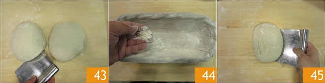 Without overworking the dough, shape two spheres with the dough scraper 43 and let them rest for 15 minutes. Now take two proofing baskets, about 10.5x4 inches (27x10 cm) or for 500 g of dough. If not available, place a cotton cloth inside. Generously sprinkle the inside of the baskets with flour 44, since the dough is very hydrated. Now shape your bread: sprinkle the work surface with flour, and transfer one of the portions onto it 45.