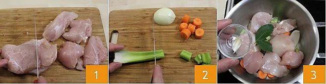To prepare the coxinhas, cut the chicken breast into bite-sized pieces 1. Peel the onion and cut it in half, wash and peel the carrot and cut it into chunks, and finally wash and cut the celery into chunks as well 2; place the chicken and vegetables in a tall pan, add two bay leaves, a clove of garlic 3 and