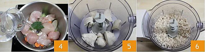 pour water 4 until the ingredients are covered and add salt. Boil the chicken until the meat is white and tender. Once the chicken is boiled, drain the chicken pieces (making sure to save the broth which will be used for the dough that surrounds the filling) and finely chop them with a knife or with the help of a blender (5-6).