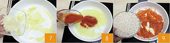 Sauté a crushed or finely chopped clove of garlic in two tablespoons of oil and let the oil infuse. Add the chopped half onion 7, let it wilt for at least 10 minutes, and then add the tomato sauce 8, cook for a few minutes, and incorporate the chopped chicken 9. Salt and pepper to taste.