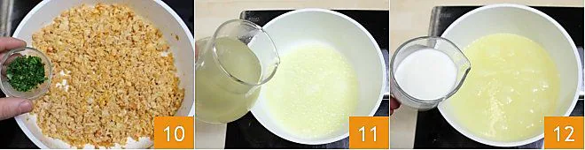 Flavor the filling with parsley 10 and set it aside to cool. Now focus on the dough that will wrap the filling: melt the butter in a pan. Add the previously obtained chicken broth 11. Pour in the room-temperature milk 12 and bring everything to a boil.