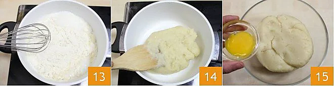 Add the sifted flour 13 and stir quickly with a whisk while everything continues to cook on low heat until the flour has absorbed the liquids and the dough detaches from the pot and becomes compact 14. Let cool slightly and finally combine the egg yolk into the dough 15.