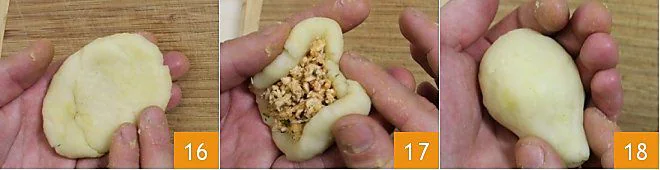 Now you can shape the coxinhas: take a portion of dough the size of the palm of your hand, about 1.7 oz 16. With the thumb of the other hand, create a cavity in the center and fill it with the filling, about 0.35 oz 17. Close the ball by wrapping the filling with the dough and shape it into a drumstick 18.