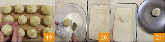 The ingredients listed are sufficient for 14 coxinhas 19. Now prepare a batter with the milk and sifted flour and place the breadcrumbs in a large bowl. Coat each coxinha first in the batter 20 and then in the breadcrumbs 21.