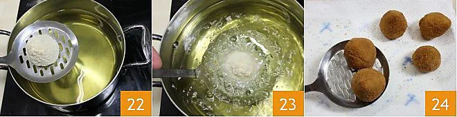 When the oil is hot (to check if the oil has reached the right temperature, use the toothpick test: immerse the tip of a toothpick in the oil, if you see it start to fry, then it is hot enough) begin frying the coxinhas one by one for a few minutes (22-23), or until the breading is golden. Drain them and let them drip on a tray lined with absorbent paper 34. Serve the coxinhas hot.