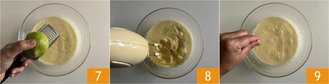 Continue by adding the grated zest of one lemon 7, keep mixing 8, and add the pinch of salt 9.