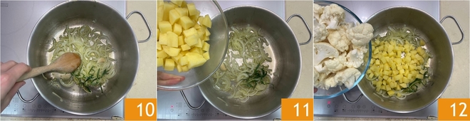 Sauté until the onion becomes soft; then add the potatoes 11 and cauliflower 12.