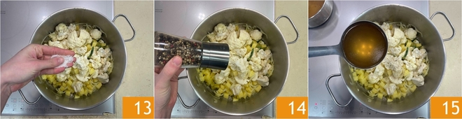 Season with salt 13 and pepper 14; mix well and cook for 5 minutes. Then add the vegetable broth to cover 15. Bring to a boil, then lower the heat and let it simmer covered with a lid for about 20-25 minutes, or until the vegetables are tender.