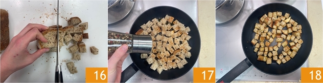 Meanwhile, cut the slices of bread into cubes 16. Transfer them to a pan, add a drizzle of oil, a pinch of salt and pepper 17. Add also some paprika. Sauté them in the pan.