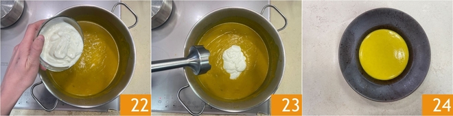 Once you have a smooth cream, incorporate the yogurt 22 and blend again 23. Serve 34.