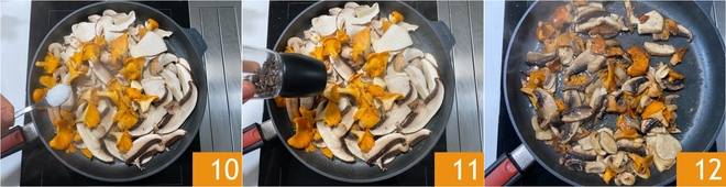 Remove the garlic, take half of the mushrooms and transfer them to a jug. Add the cream 13 and blend with an immersion blender 14 until you get a homogeneous cream 15. Set the rest of the mushrooms aside.