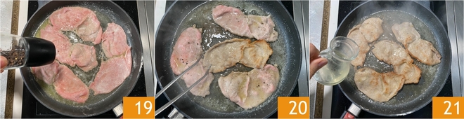 Season with salt and pepper 19 and brown over medium heat for 4 minutes, then turn them 20 and deglaze with white wine 21. Cook on the other side for about 3 more minutes until golden. Once cooked, set the meat aside covered with a sheet of aluminum foil.