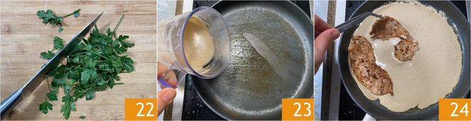 Chop the parsley with a knife 22. Still in the same pan, pour the mushroom cream 23, then add the meat 34 and heat over low heat for a minute, without stirring.