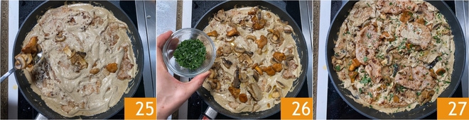 Finally, add the mushrooms 25 and the chopped parsley 26 and cook for another minute. Your creamy mushroom scaloppine are ready to be served 27!