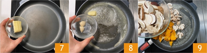 Melt the butter in a pan 7, add the garlic 8 and let it flavor for a few minutes. At this point, add the mushrooms 9.