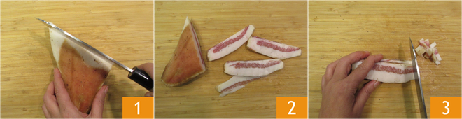 To prepare the creamy paccheri with guanciale and pistachio, remove the rind from the guanciale 1, then slice it 2 and cut it into strips 3.