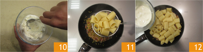 Stir to soften it 10. Drain the paccheri into the pan with guanciale and pistachios 11. Add the creamy cheese 12 and toss over medium heat.