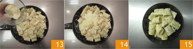 Add the grated Parmesan 13 and stir 14. Serve the creamy paccheri with guanciale and pistachios immediately 15.