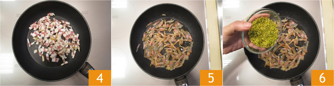 Place it in a pan (without adding oil) and brown it for about 10 minutes over medium heat 4, turning it often with a wooden spoon. Once well browned 5, add the chopped pistachios to the guanciale 6 and toast them for about 2 minutes.