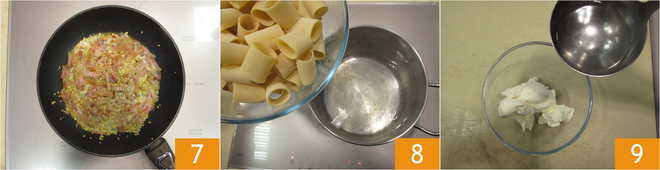 Set aside the sautéed guanciale with the chopped pistachios 7. Put a pot of water on the heat to cook the paccheri and salt it once it boils. Cook the paccheri al dente, about 7–8 minutes 8. Take a ladle of the cooking water, or as much as needed 9, to loosen the creamy cheese.
