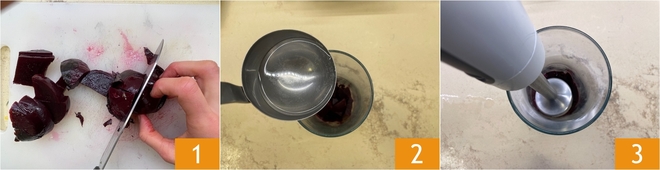 To prepare the creamy risotto with Sicilian caponata, cut the pre-cooked beetroot into pieces 1, place it in a jug, add a ladle of water 2 and blend everything with an immersion blender 3.
