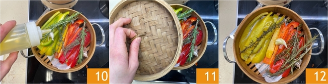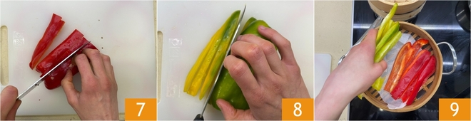 Slice them into strips 7 and do the same with the yellow peppers 8. Place a bamboo steamer over the heat, line it with a sheet of parchment paper and lay the peppers on it 9.
