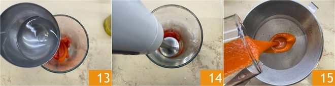 Transfer the red peppers to the jug with a ladle of the cooking water 13 and a drizzle of oil, blend them 14 and strain through a sieve 15.