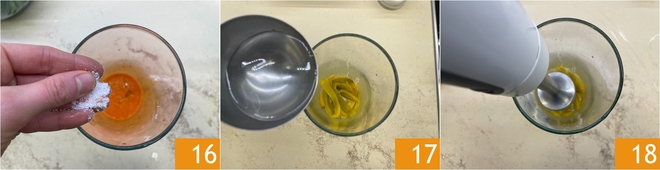 Season the resulting sauce with a pinch of salt 16. Do the same with the yellow peppers: put them in a jug with a ladle of water 17 and blend them 18.