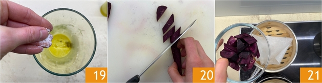 Strain and season the yellow sauce with salt 19. Now take care of the purple carrots: peel them and cut them into pieces 20. Proceed to steam them 21.