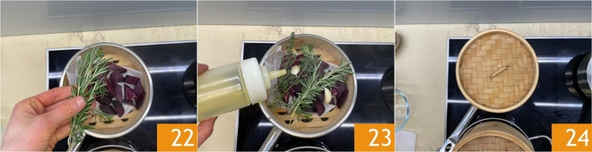 Always season with rosemary 22, thyme, garlic and a drizzle of oil 23. Cover with the lid and cook for 30 minutes 34.