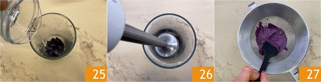 Once cooked, transfer the carrots to the jug with the usual ladle of water 25, blend 26 and strain 27.