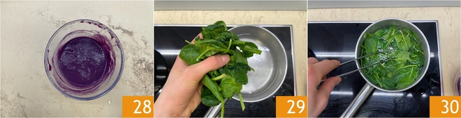 Salt your purple sauce 28. Now proceed with the final sauce: boil the spinach in boiling water 29 until tender 30.