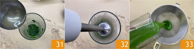 Transfer the cooked spinach to the jug with a ladle of water 31, blend with the immersion blender 32 and strain through the sieve 33. Salt and set aside the green sauce.