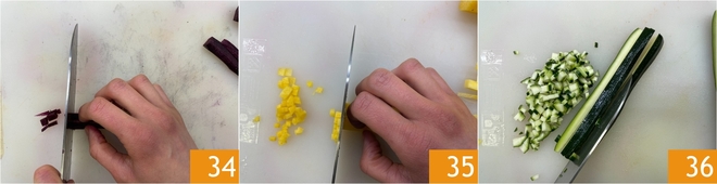 Now take care of the raw vegetables that will form the base of the risotto: trim and dice the purple carrots into very small cubes 34, the yellow carrots 35 and the green part of the zucchini 36.