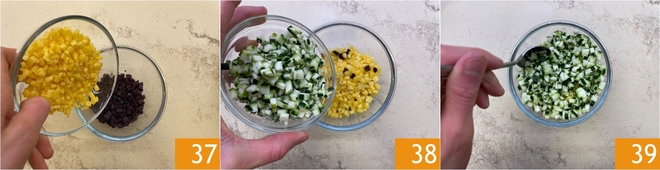 In a bowl combine the diced carrots 37 and zucchini 38, mix 39 and set aside.