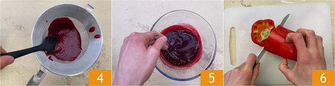 Strain the resulting sauce through a sieve 4, season with salt, stir and set aside the first sauce 5. Clean the red peppers by removing the stem 6 and extracting the inner membranes and seeds.