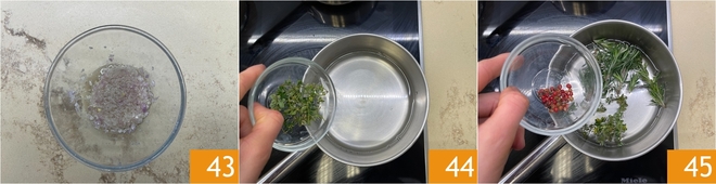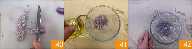 Prepare the shallot: trim and dice it without crushing 40, otherwise it will turn bitter. Put it in a bowl with the oil 41, cover with microwave-safe plastic wrap 42 and cook in the microwave for 10 seconds on high (about 750 W). Take the bowl out and stir the shallot, then repeat the same operation 3 times. This will soften the acidic note and bring out only the sweetness of the shallot.