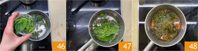 Add the basil 46 and heat the water so it does not exceed 176°F 47. Let it infuse for an hour 48.