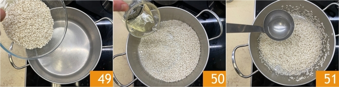 Cook the rice: in a pan pour the rice and dry-toast it 49, deglaze with the white wine 50, let it evaporate, then start cooking with a couple of ladles of warm water 51, salt and cook for 5-6 minutes.